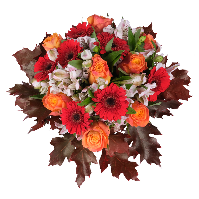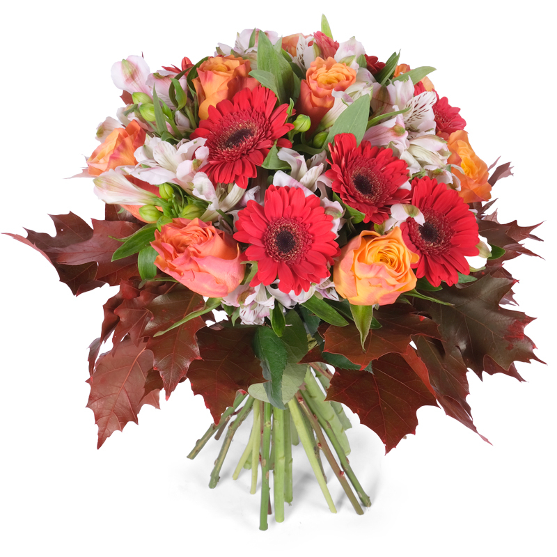 Ten bukiet łączy w sobie świeżość róż, radość gerber i delikatność alstromerii. Całość otulona jesiennymi liśćmi tworzy harmonijną całość. Idealny dla osób, które lubią kwiaty z charakterem. Wnosi do wnętrza ciepło i pozytywną energię. To prezent, który mówi „myślę o Tobie”.