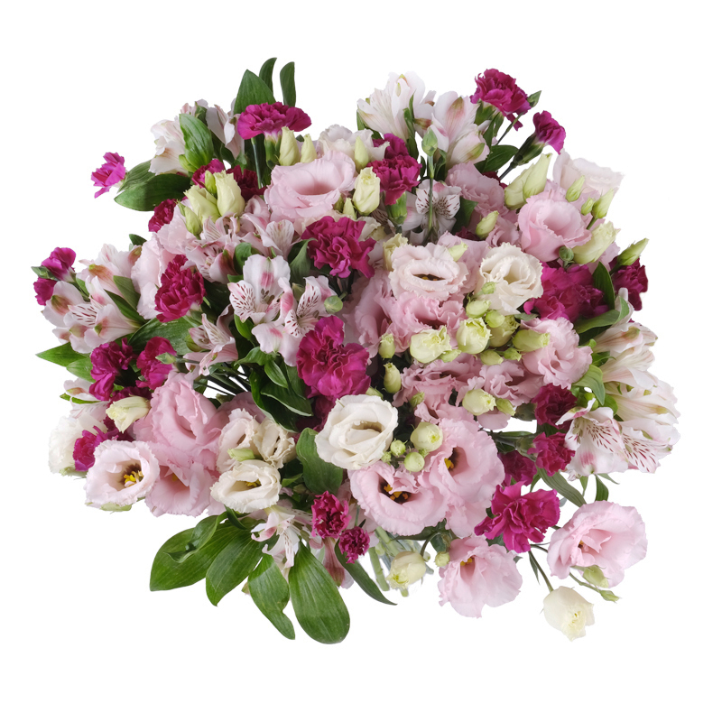 „Miłosny list” to bukiet złożony z eustomy, alstromerii i goździka, który emanuje romantyzmem i głębią uczuć, podkreślonych różowymi barwami z mocniejszymi tonami.